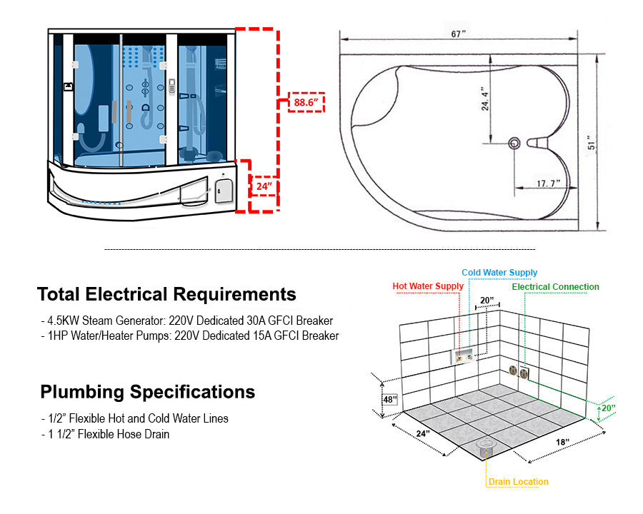 Inside the Siena Steam Shower you€™ll find many relaxing elements including acupressure massage, aromatherapy, foot massage, and the popular rainfall ceiling shower. Entertainment options with your Steam Shower Unit include MP3 compatible, FM Radio with audio frequency input, a high quality speaker system, and of course the TV and telephone. The perfectly designed acrylic Steam Shower unit is reinforced with durable fiberglass backing, includes a solid stainless steel framing and fixtures such as door handles, towel racks, shampoo racks etc, and uses beautiful tempered glass known for strength and longevity. This Steam Shower Unit fits nicely in the corner maximizing bathroom floor space.